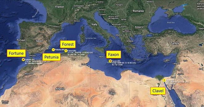 13h43: Tàu dầu mang tên Faxon - con tàu thứ 4 trong đội hình 5 tàu của Iran hiện đang hành trình ở trên Biển Địa Trung Hải, ngoài khởi Tuy-ni-di. Nó đang tiến dần tới eo biển Gibraltar để tiến ra Đại Tây Dương tới Venezuela.