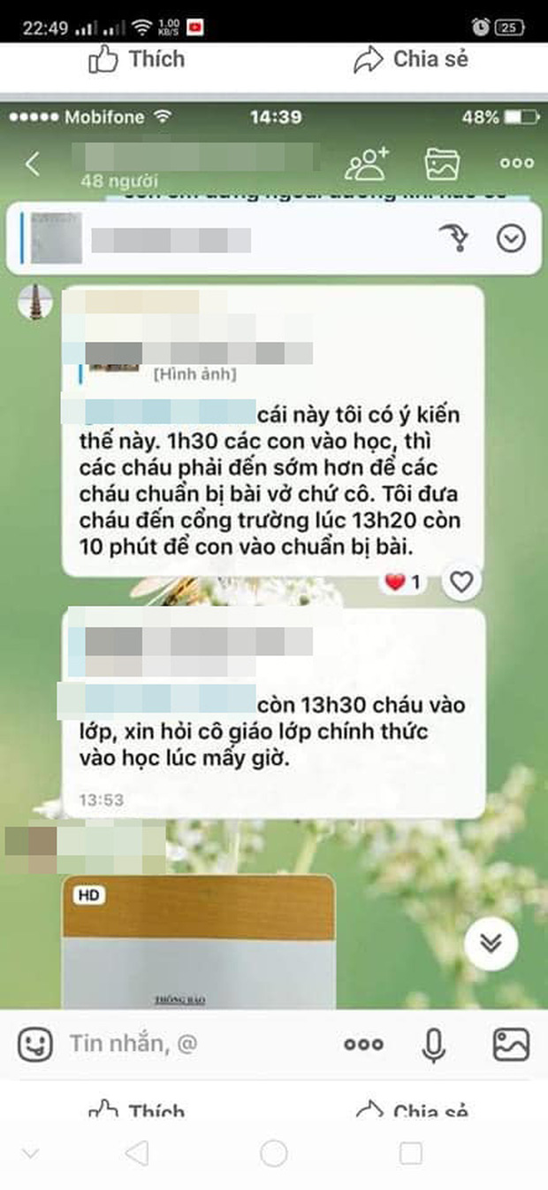 "Con tôi học lớp 1 tại trường Tiểu học Quang Trung. Trước thời gian nghỉ học vì dịch, tôi vẫn cho cháu ăn bán trú. Sau thời gian này vì hoàn cảnh không có khả năng ăn bán trú tiếp nên tôi cho cháu về nhà ăn. Nhưng tôi phải đi làm sớn nên 1h15 phút đã cho cháu đến trường. Còn thông báo của Ban giám hiệu là những bạn không ăn bán trú 1h30 mới được có mặt.