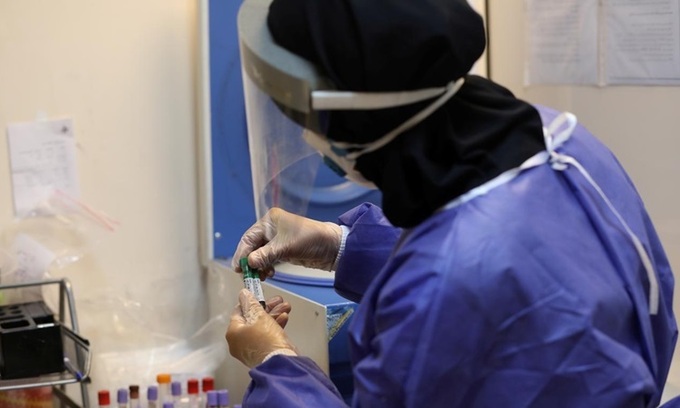 Một nhân viên y tế Iran trong trang phục bảo hộ đang thu thập mẫu máu tại một trung tâm xét nghiệm nCoV ở Tehran hôm 20/5. Ảnh: Reuters.