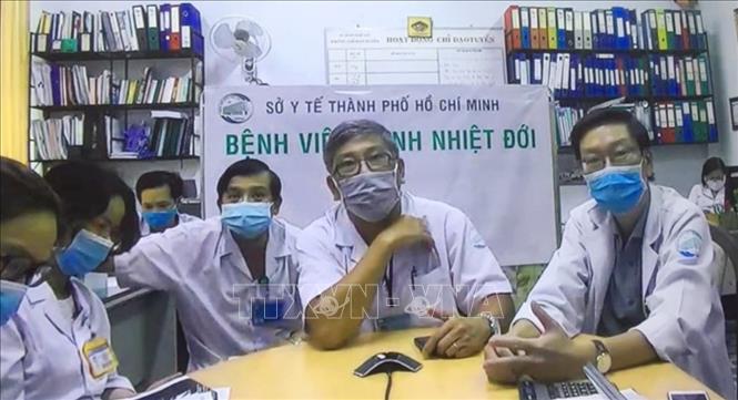 Các bác sỹ Bệnh viện Bệnh Nhiệt đới Thành phố Hồ Chí Minh hội chẩn trực tuyến về ca bệnh 91 với Tiểu ban điều trị, Ban Chỉ đạo quốc gia phòng, chống COVID-19. Ảnh: TTXVN phát