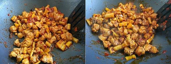 - Bước 3: Đun nóng chút dầu ăn trong chảo, cho tỏi băm vào xào thơm sau đó thêm măng và xốt ớt, đảo đều.