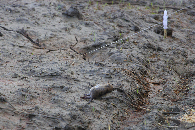 "Mỗi đêm tôi giăng bẫy điện khoảng 2 giờ, diệt được hàng chục con chuột", ông Lượng nói và cho hay ông vứt chuột chết lên đường quốc lộ 49B chạy cạnh khu ruộng.
