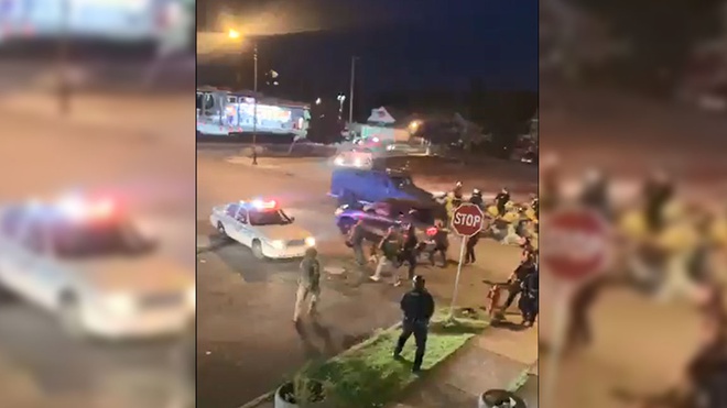 Một lát sau, có tiếng súng bắn trong video, sau đó các sĩ quan cảnh sát bỏ chạy khi một chiếc SUV lao vào họ. Ít nhất một người bị cán dưới bánh xe.