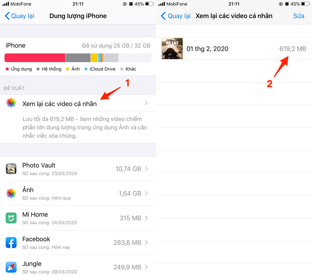 Nếu đã lưu trữ các video yêu thích lên đám mây, bạn có thể xóa chúng khỏi thiết bị bằng cách vào Settings (cài đặt) - General (cài đặt chung) - iPhone Storage (dung lượng iPhone) - Review Personal Videos (xem lại các video cá nhân), cuối cùng chọn các tệp video có dung lượng lớn và xóa chúng khỏi iPhone.