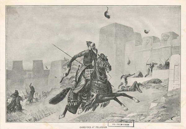 Thậm chí ông còn cho buộc hàng trăm chú mèo lên phía trước lá chắn để "dẫn đường". Chiến thuật này đã phát huy tác dụng. Các cung thủ Ai Cập không thể bắn tên vì sợ bị thánh thần hiển linh trừng phạt, dẫn đến việc quân Ai Cập thất thủ và các Pharaoh bị bắt giữ.