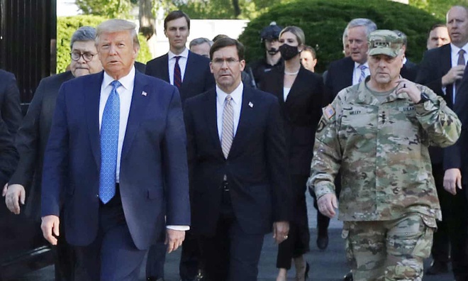 Ông Mark Milley và Bộ trưởng Quốc phòng Mark Esper đã đi bộ cùng Tổng thống Trump trong chuyến đi bất ngờ của người đứng đầu Nhà Trắng tới nhà thờ St. John hôm 1/6, nơi ông Trump giơ cuốn Kinh Thánh để cho giới truyền thông chụp ảnh.