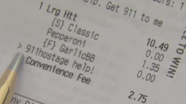 Sau khi đặt một chiếc bánh pizza cỡ lớn, Cheryl đã ghi chú thêm cho nhân viên cửa hàng dòng chữ: "Xin hãy giúp tôi.
