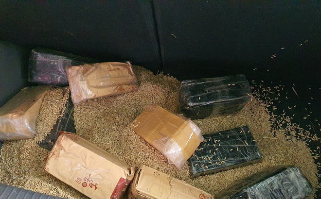 Để qua mắt lực lượng chức năng, các đối tượng đã giấu ma túy vào trong bao tải đựng vỏ trấu nhưng không thoát.