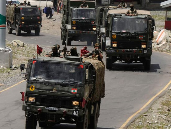 Đoàn xe quân sự Ấn Độ trên cung đường Srinagar dẫn đến khu vực biên giới Ladakh thuộc vùng Kashmir đang tranh chấp giữa Ấn Độ, Trung Quốc và Pakistan ngày 17-6. Ảnh: ANADOLU/GETTY IMAGES