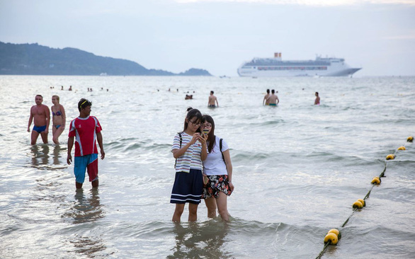 Du khách chụp ảnh tại bãi biển Patong ở Phuket, Thái Lan thời điểm trước khi nước này đóng cửa với du khách quốc tế vì dịch COVID-19 - Ảnh: BLOOMBERG