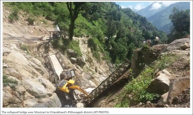 Tờ Hindustan Times (Ấn Độ) ngày 23/6 đưa tin, vào khoảng 9h sáng ngày 22/6, cây cầu duy nhất nằm trên tuyến đường dẫn tới biên giới Trung-Ấn đã bất ngờ bị gãy sau khi một chiếc xe tải chở máy móc hạng nặng phớt lờ cảnh báo nguy hiểm để đi qua.