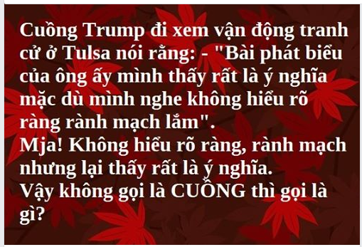 Là người chống Trump, bạn nghĩ sao và có "ba mặc cảm" kể trên không? Thú thật với bạn, tôi không dám bảo các lý do này là sàm mà đến ... ba sàm. Bởi mặc cảm duy nhất tôi có là ... không có được ba cái mặc cảm nói trên để được gọi là "cuồng chống Trump" như tác giả phân tích. Chỉ hơi thắc mắc là Ba Sàm bảo giới chống Trump là có học và thu nhập cao như trong bài viết thì tại sao họ lại "mặc cảm kém tri thức" và "hậm hực vì mất mát quyền lợi" mà họ không hưởng hay nếu có thì chỉ ở những ngày đầu trên xứ người đã quá lâu?