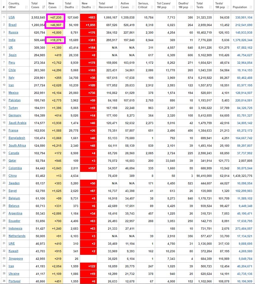 Brazil, vùng dịch lớn thứ hai thế giới, báo cáo thêm 41.827 ca nhiễm và 907 ca tử vong, nâng tổng số lên lần lượt 1.274.974 và 55.961. Các nhà nghiên cứu lo ngại số người chết vì Covid-19 trên thực tế tại Brazil bị che đậy.