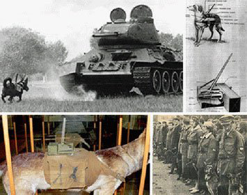Chó chống tăng được Liên Xô dùng trong Thế chiến II để chống lại xe tăng Đức. Những con chó này được huấn luyện tìm thức ăn dưới những chiếc xe tăng và bị bỏ đói trước mỗi trận đấu. Khi sắp lâm trận chúng được cho mang bom trên lưng, kèm đó là đòn bẩy sẽ bật lên khi chó chui xuống gầm xe. Khi đòn bẩy rơi trở lại, con chó sẽ phát nổ.