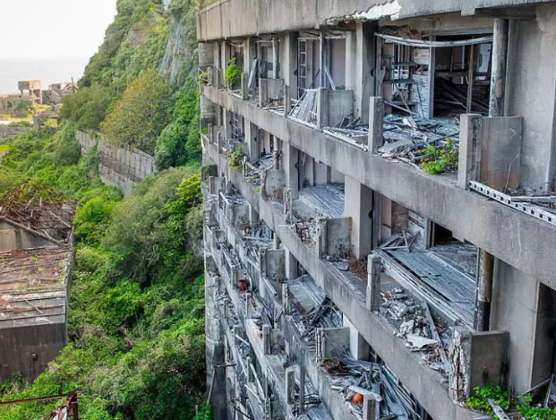 Hòn đảo bỏ hoang này nằm cách Nagasaki, Nhật Bản 15km. Đảo Hashima còn bị gọi là đảo ma bởi đến đây bạn chỉ nhìn thấy những tòa nhà bê tông đổ nát. Năm 1890, tập đoàn Mitsubishi đã mua hòn đảo này với ý định khai thác than. Họ cũng đã xây dựng các cơ sở hạ tầng, nhiều tòa nhà bê tông lớn trên đảo. Hàng ngàn công nhân sống trong các tòa nhà này để khai thác than vào thời điểm đó. Nhưng tập đoàn Mitsubishi buộc phải đóng cửa toàn bộ dự án khi xăng dầu thay thế than vào năm 1960, đóng cửa khai thác vào năm 1974, vì thế công nhân rời đi hết. Sau khi bị đóng cửa và trở thành một hòn đảo bỏ hoang với vô số lời đồn đại, năm 2009, chính phủ Nhật Bản đã mở lại hòn đảo ma này cho mục đích du lịch.