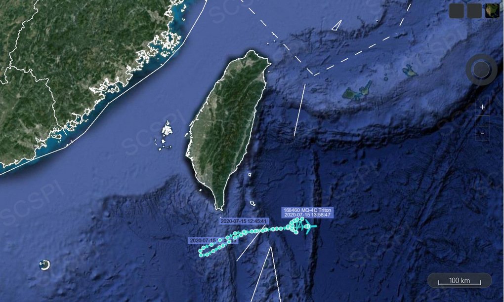"Máy bay trinh sát không người lái MQ-4C Triton của hải quân Mỹ tuần tra khu vực đông nam Đài Loan hôm 15/7. Hiếm khi phát hiện được UAV Mỹ trên Biển Đông", tổ chức Sáng kiến Tình hình Chiến lược Biển Đông (SCSPI) thuộc Viện Nghiên cứu Đại dương Đại học Bắc Kinh, Trung Quốc, đăng trên Twitter hôm qua.