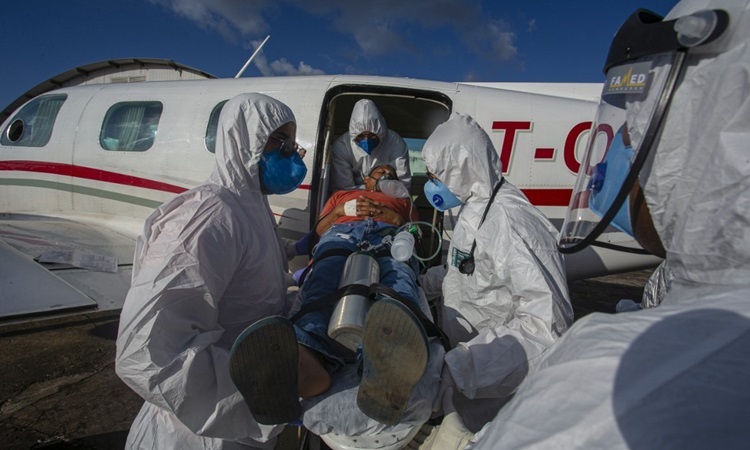 Bệnh nhân Covid-19 được đưa khỏi máy bay ở thành phố Santarem, bang Para, Brazil hôm 15/7. Ảnh: Reuters.