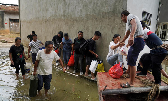 Những cư dân mắc kẹt do mưa lũ xếp hàng lên thuyền để sơ tán khỏi một ngôi làng ở huyện Bà Dương, tỉnh Giang Tây, Trung Quốc, hôm 16/7. Ảnh: Reuters.
