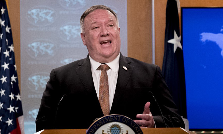 Ngoại trưởng Mỹ Mike Pompeo tại buổi họp báo ở Bộ Ngoại giao hôm 15/7. Ảnh: AFP.