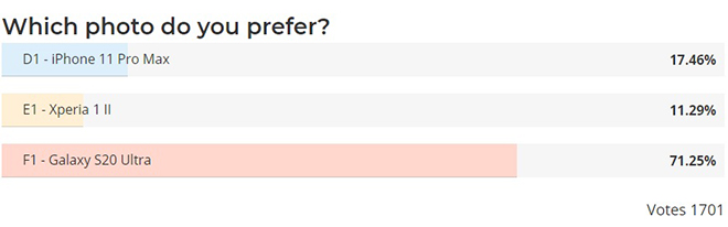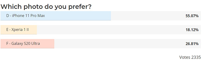Do đó, trang tin công nghệ Phone Arena đã tiến hành kiểm tra camera giữa Sony Xperia 1 II, Samsung Galaxy S20 Ultra và iPhone 11 Pro Max thông qua bài kiểm tra ảnh “mù” – người xem không biết hình ảnh nào được chụp bởi thiết bị nào. Các tiếp cận này có phần khách quan hơn với người dùng, giúp họ dễ dàng tìm ra những chiếc điện thoại chụp ảnh tốt nhất của năm.
