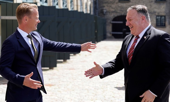 Ngoại trưởng Mỹ Mike Pompeo hào hứng đưa tay ra bắt khi gặp các quan chức ngoại giao Đan Mạch, nhưng đều bị từ chối vì quy tắc ngăn Covid-19.