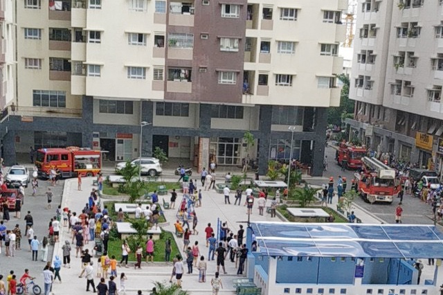 Nhiều cư dân hoảng hốt tháo chạy khỏi chung cư. Ảnh: C.D.