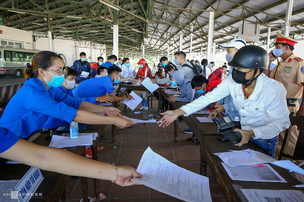 Sau khi khai báo y tế về nơi khởi hành, nơi đến, tình trạng sức khỏe, số điện thoại liên hệ, người về từ Đà Nẵng sẽ nộp giấy lại cho trạm kiểm soát số 5.