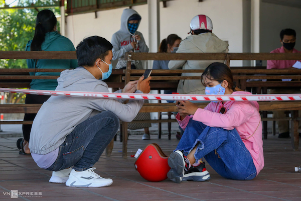 Nhiều người dân ngồi bệt dưới sàn nhà chờ đợi tin nhắn hồi đáp từ phần mềm chống dịch Covid -19 của tỉnh Thừa Thiên Huế, để xem mình được phép rời khỏi trạm kiểm soát hay phải đi cách ly tập trung.