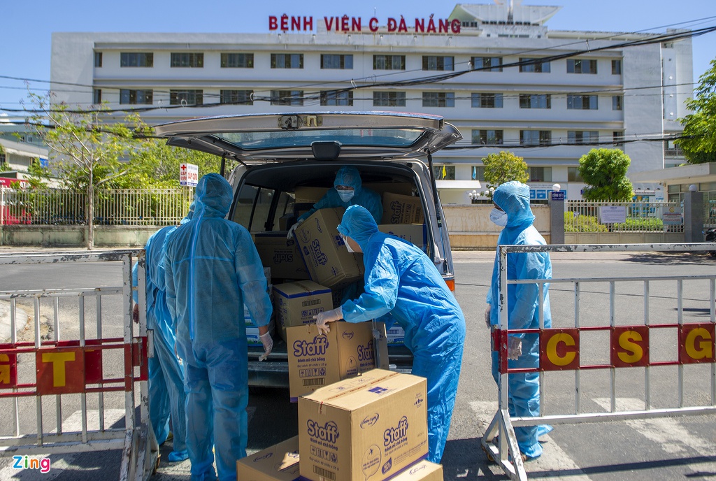 Bệnh viện Đà Nẵng là một trong những nơi đang bị phong tỏa. Các nhân viên bệnh viện phải luôn mặc trang phục bảo hộ khi làm việc cũng như ra ngoài nhận thuốc và vật tư y tế. Ảnh: Phạm Ngôn.