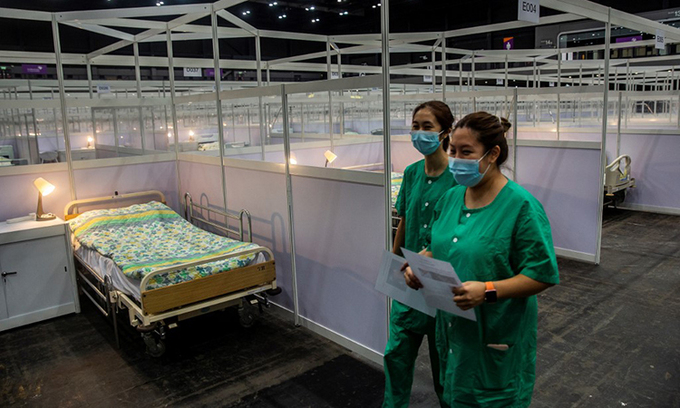 Nhân viên y tế đi qua dãy giường tại bệnh viện dã chiến cải hoán từ trung tâm triển lãm Asia World ở Hong Kong, ngày 1/8. Ảnh: AFP.