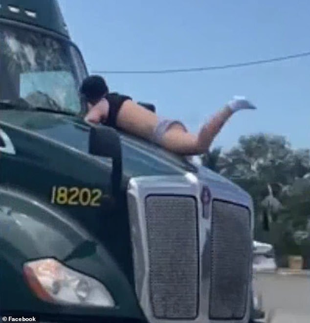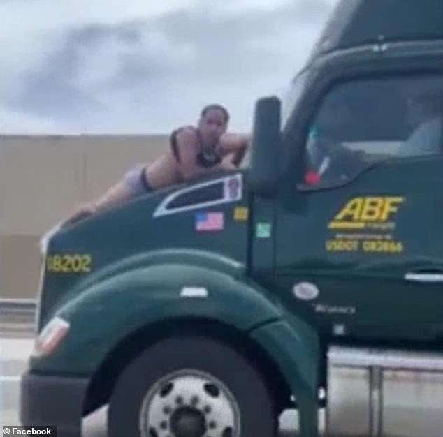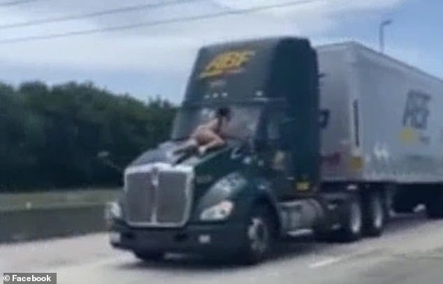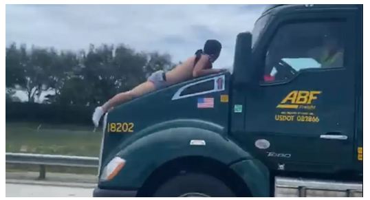 Người đi cùng người đàn ông này kể với đội Tuần tra Cao tốc Florida (FHP) rằng sau khi nhảy qua dải phân cách và khiến các phương tiện khác chạy chậm lại, ông ta nhảy lên ca-pô của chiếc xe đầu kéo.