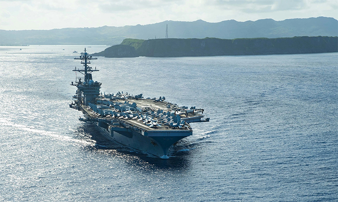 Tàu sân bay USS Theodore Roosevelt rời quân cảng trên đảo Guam ra khơi sau hai tháng dừng hoạt động, ngày 21/5, Ảnh: US Navy.