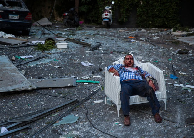 Một người dân ở Beirut bị thương chán nản nhìn cơ ngơi của mình ra tro sau vụ nổ (ảnh: Reuters)