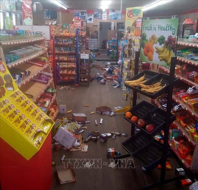 Hàng hóa rơi đổ bên trong một cửa hàng ở bang Bắc Carolina, Mỹ sau trận động đất ngày 9/8/2020. Ảnh: AP/TTXVN
