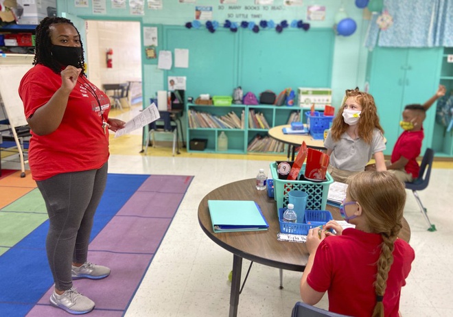 Cô giáo lớp bốn Krileshia Boyd nói chuyện với học sinh của mình tại trường Tiểu học Đông Bắc Lauderdale ở hạt Lauderdale, bang Mississippi hôm 10/8. Ảnh: AP.