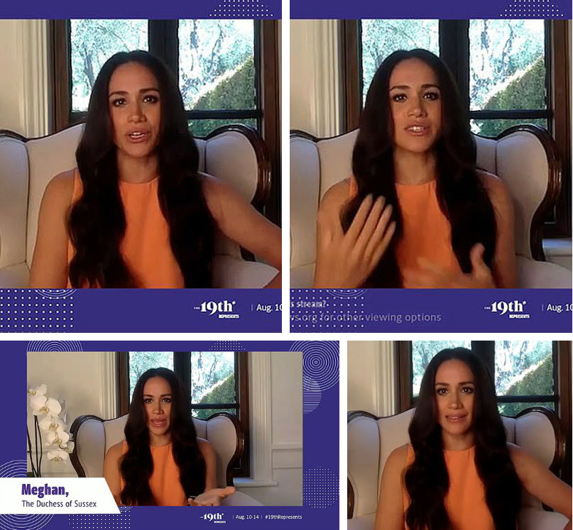 Trong lần xuất hiện mới nhất, Meghan lựa chọn chiếc đầm màu cam nổi bật, trang điểm sắc nét với mái tóc đen dài buông thả tự nhiên. Đây là lần thứ 2 Meghan xuất hiện trong vai trò người phát biểu tại một hội nghị thượng đỉnh online. Meghan bắt đầu cuộc trò chuyện bằng việc đề cập đến kinh nghiệm đối phó với phương tiện truyền thông nhiều năm qua.