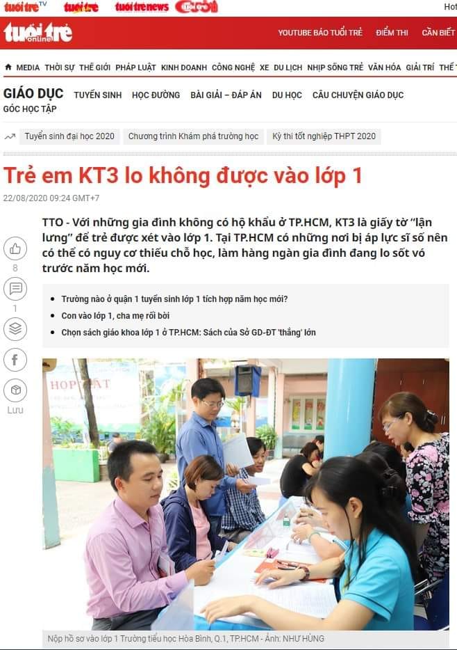 Hôm nay trên báo Tuổi Trẻ có bài viết “Trẻ em KT3 lo không được vào lớp 1”. Hiện nay những người không có hộ khẩu mà chỉ có KT3 có nguy cơ con cái không vào lớp 1 được. Chính CS đã đẻ ra sổ hộ khẩu để định giá cho loại công dân hạng 1, họ đẻ ra tiếp cái gọi là KT3 để định giá loại công dân hạng 2 , và thành phần còn lại được định giá là công dân hạng 3. Theo bài báo này, hiện nay đang có hàng ngàn trẻ em có nguy cơ bị tước mất quyền được đi học vì thứ quy định bệnh hoạn này. Trẻ nó có tội lỗi gì mà sao ra luật để tước bỏ quyền cơ bản của chúng? Đã không soạn luật, không làm chính sách ưu tiên cho chúng thì thôi chứ sao lại ra loại quy định bệnh hoạn để làm hại chúng?