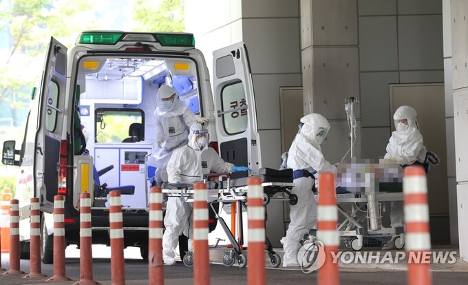 Nhân viên y tế chuyển một bệnh nhân có triệu chứng Covid-19 đến một bệnh viện ở phía bắc Seoul hôm 24/8. Ảnh: Yonhap.