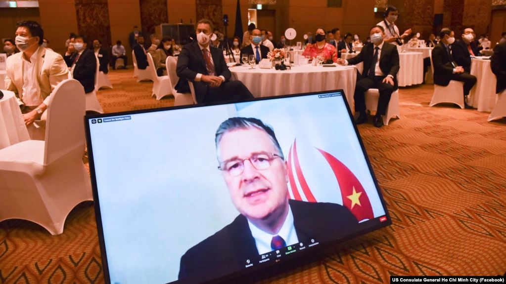 Đại sứ Mỹ tại Việt Nam Daniel Kritenbrik phát biểu trực tuyến tại Diễn đàn Doanh nghiệp TPHCM-Hoa Kỳ được tổ chức tại TPHCM hôm 25/8.