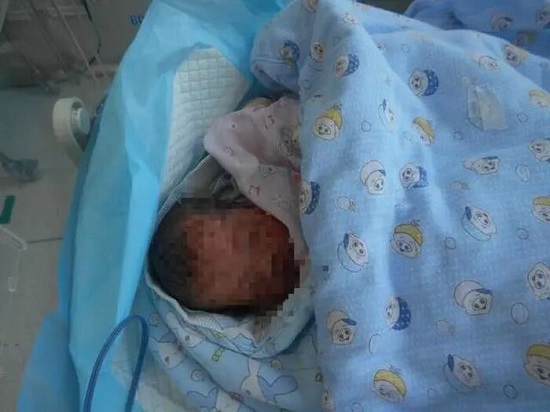 Bé gái rất yếu, được quấn trong một chiếc chăn màu xanh. Ảnh: Sbskr.
