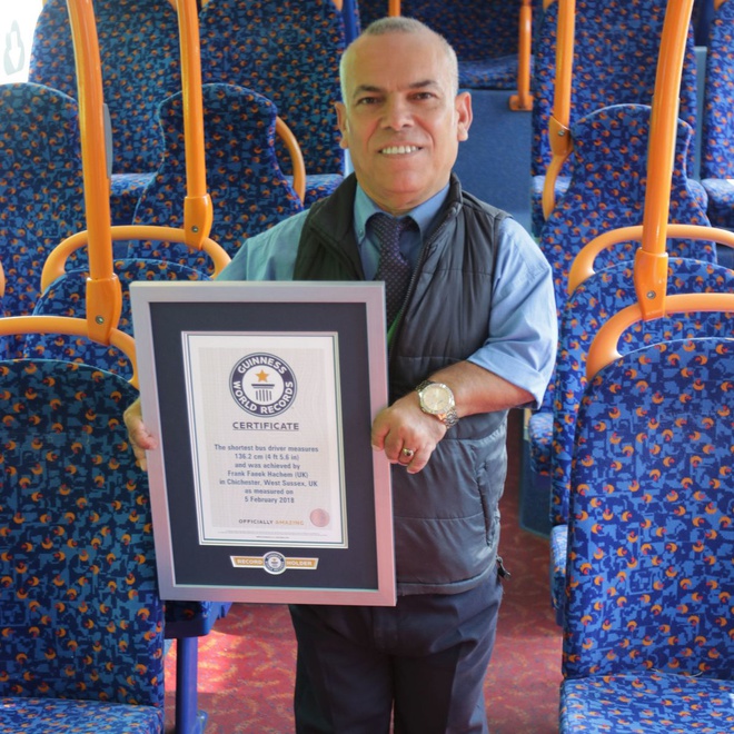 Tài xế xe buýt lùn nhất thế giới đã được ghi vào kỷ lục Guinness. Frank Faeek Hachem chỉ cao ở mức 1,36 m, anh vẫn duy trì công việc lái xe buýt như bao tài xế bình thường khác mà không cần đến thiết bị hỗ trợ. Năm nay Frank Faeek Hachem (55 tuổi, Anh) đạt kỷ lục Guinness với danh hiệu tài xế xe buýt lùn nhất thế giới, theo Standard UK.