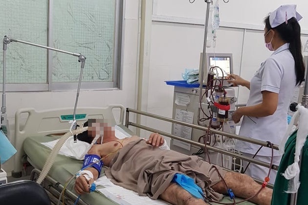 Sau khi nhập viện khoảng 10 phút, bệnh nhân rơi vào hôn mê sâu, đồng tử giãn, tê liệt hoàn toàn tứ chi, mất tri giác. Các bác sĩ nhanh chóng đặt nội khí quản và lọc máu cho bệnh nhân.