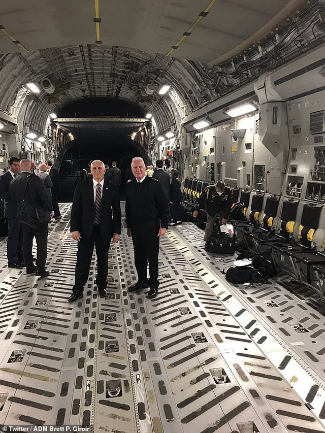 Ông Pence quay về thủ đô Washington trên máy bay vận tải C-17 (Ảnh: Twitter)