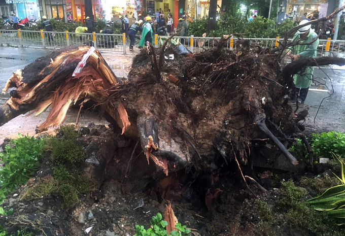 15h30, mưa to, gió giật mạnh, cây dầu cao khoảng 30 m, đường kính 70 cm đối diện Đại học Kinh tế TP HCM đã bật gốc ngã xuống đường. Nam thanh niên 30 tuổi chạy xe máy hướng từ vòng xoay Nguyễn Tri Phương về đường 3 Tháng 2 bị cây đè trúng. Mọi người xung quanh chạy đến giải cứu nạn nhân.