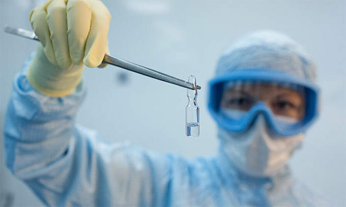 Chuyên gia Nga cầm lọ chứa vaccine Covid-19 tại một cơ sở sản xuất gần thành phố Moskva, ngày 7/8. ẢNh: RDIF.