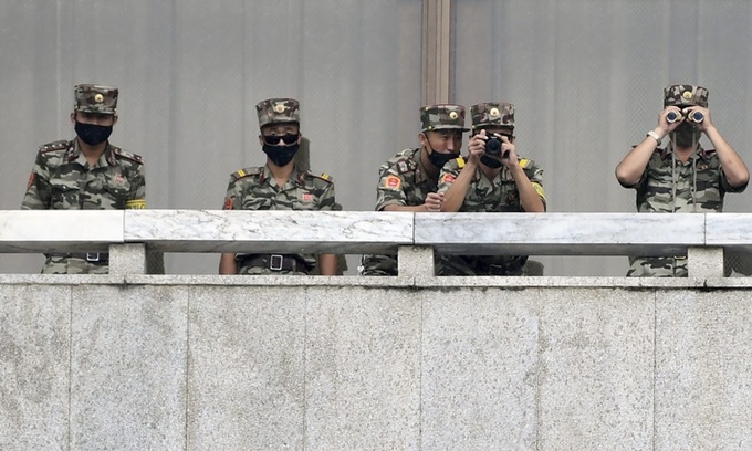 Các binh sĩ Triều Tiên nhìn về phía biên giới Hàn Quốc bên trong Khu Phi quân sự liên Triều (DMZ) ngày 16/9. Ảnh: AP.