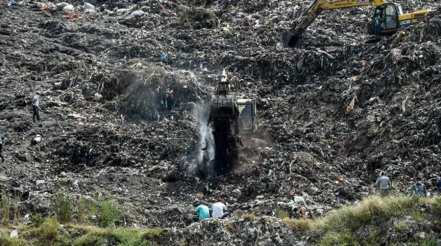 Lực lượng cứu hộ nỗ lực tìm kiếm Neha Vasava, 12 tuổi, bị chôn vùi khi núi rác khổng lồ sập xuống khi em đang nhặt phế liệu phía dưới.