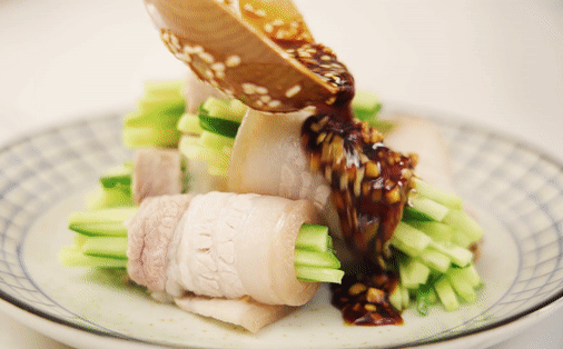 - Bước 5: Đổ nước sốt vừa pha vào đĩa thịt cuộn dưa chuột là xong.