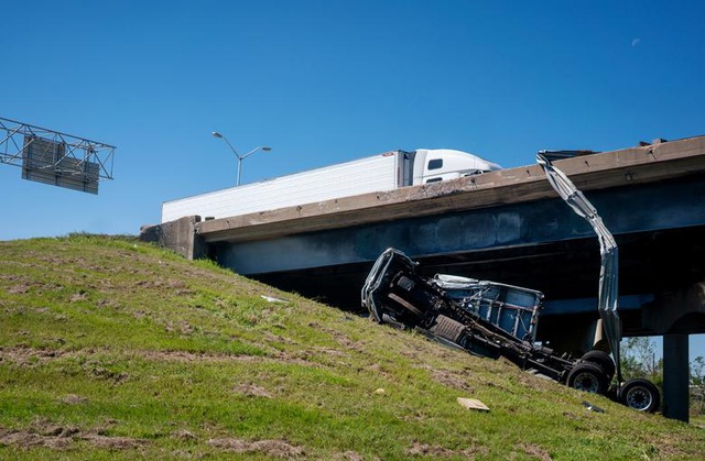 Hiện trường vụ xe tải bị lật khỏi đường I-10 khi Delta đổ bộ Lake Charles, Louisiana.