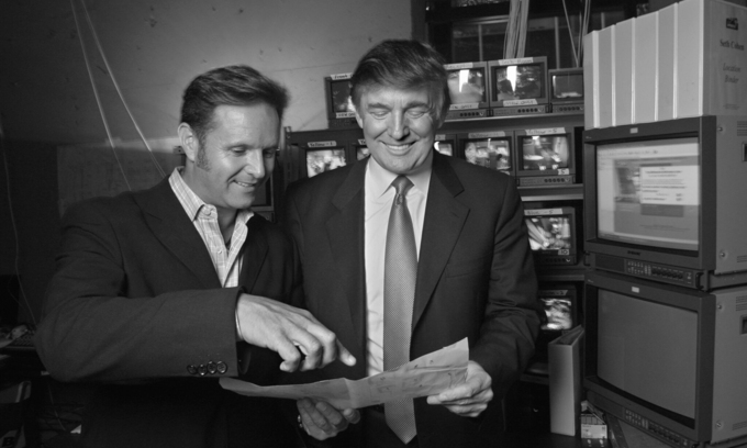 Donald Trump (phải) và Mark Burnett, giám đốc sản xuất chương trình "The Apprentice", trong phòng ghi hình ở tháp Trump năm 2003. Ảnh: NYTimes.